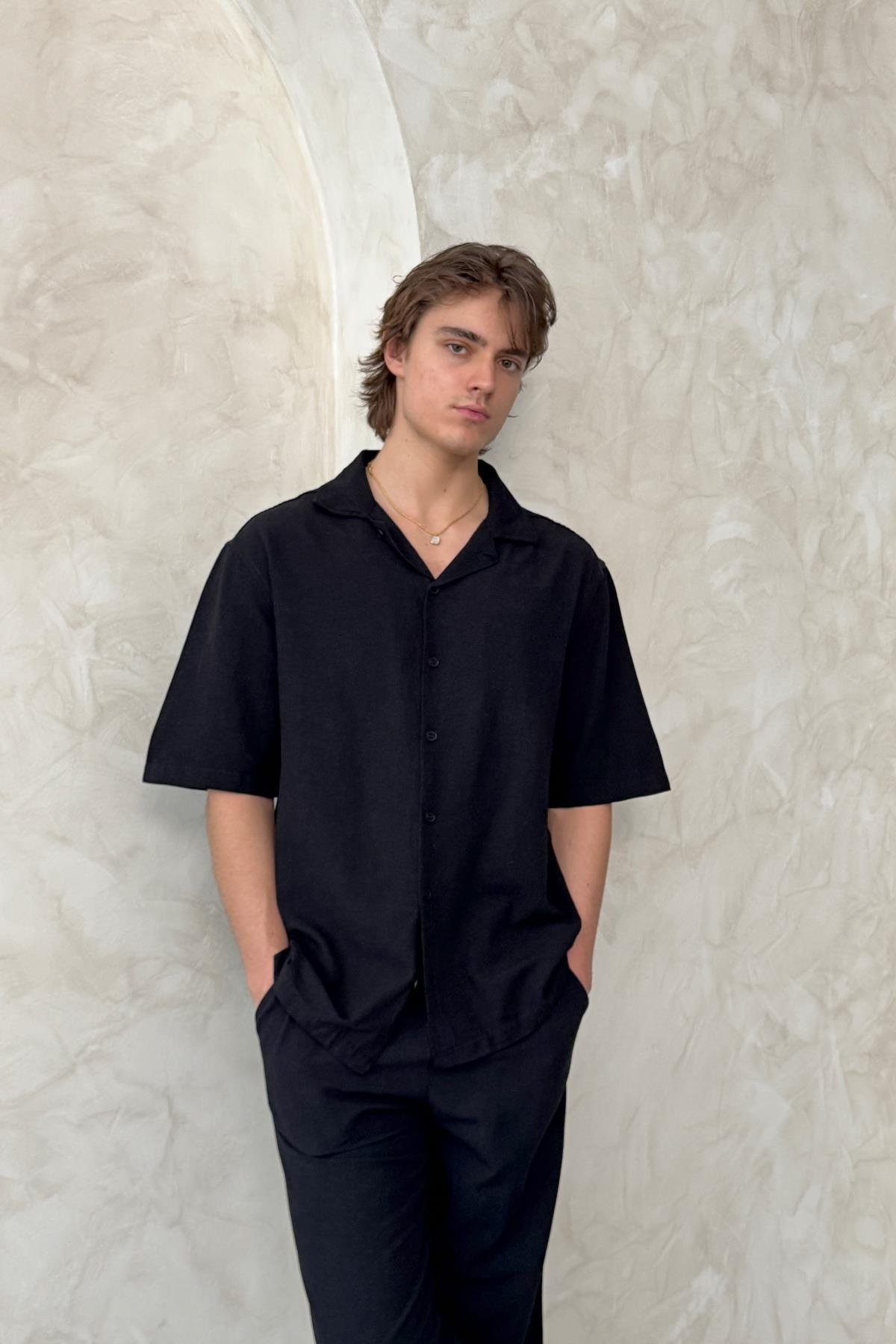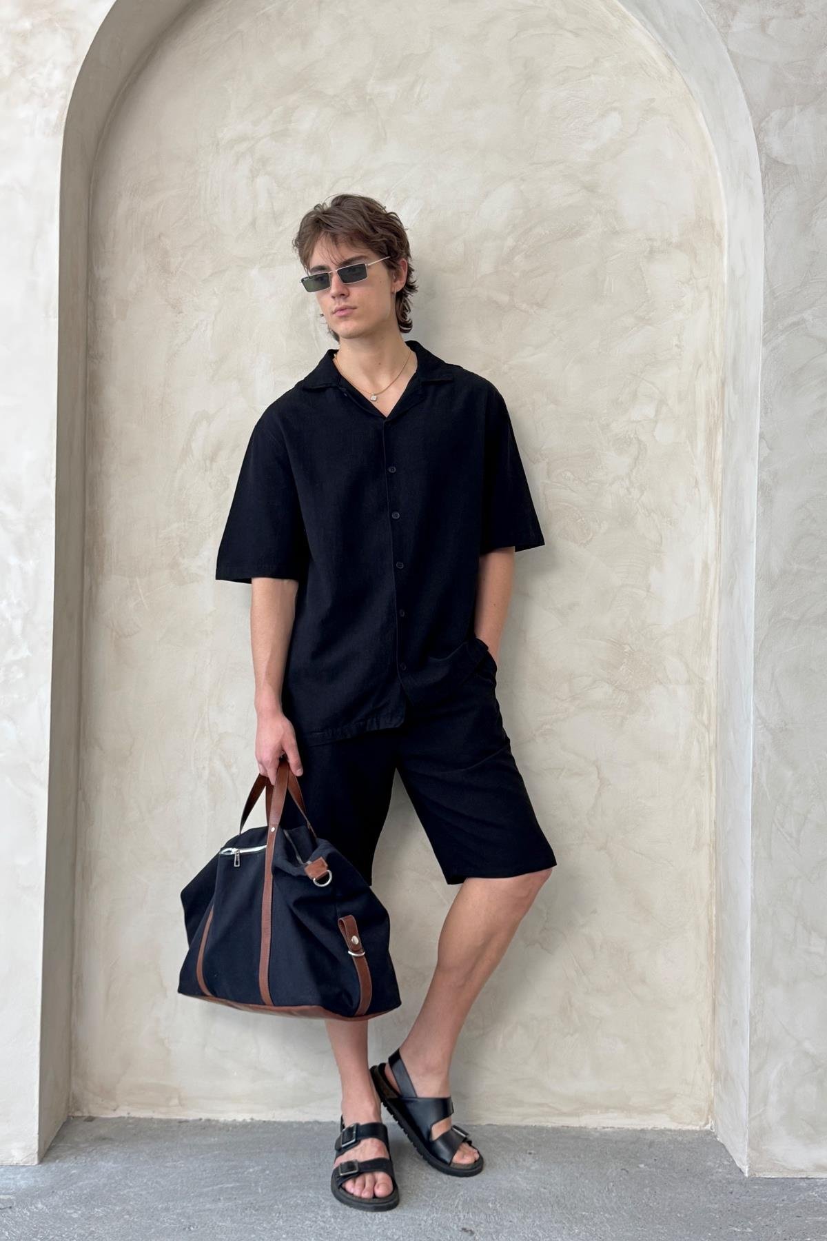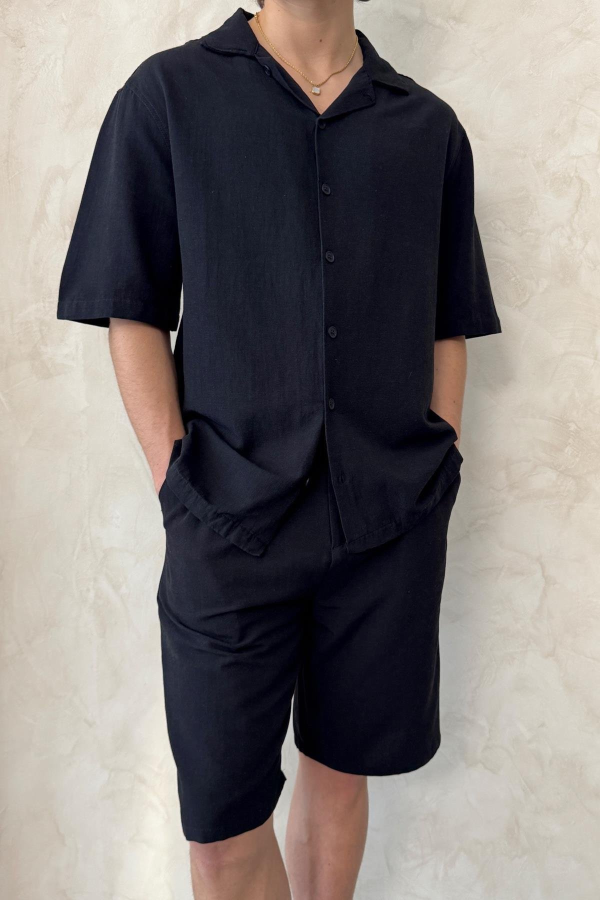 Erkek Oversize Keten Gömlek Şort Takım Siyah (HY25YE29005SIYAHS)