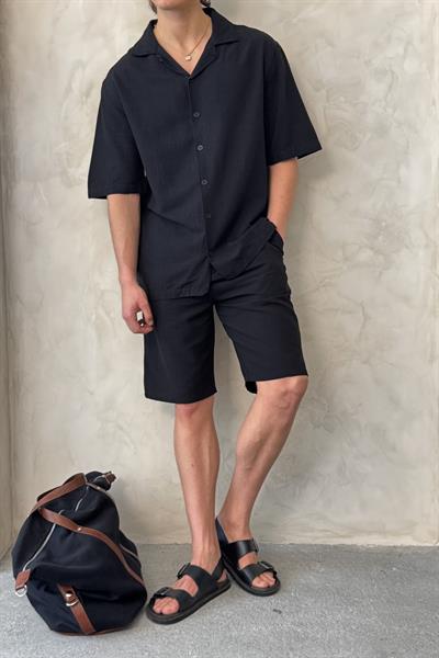 Erkek Oversize Keten Gömlek Şort Takım Siyah (HY25YE29005SIYAHS)