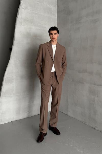 Erkek Oversize Rahat Kalıp Kruvaze Takım Elbise Kahverengi (HY-30820-KAHVE-S)